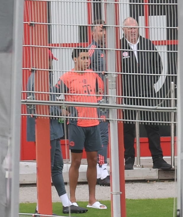 周四中午在拜仁的队友们进行赛前最后一次训练时,《图片报》在塞贝纳大街训练场边拍到了穆西亚拉:他穿着拖鞋出现在训练前,和他的队友们开着玩笑,心情非常好。在训练开始前,他与主教练孔帕尼交谈了将近五分钟。